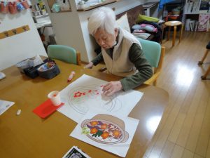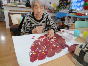 暑さが落ち着き、過ごしやすく穏やかな日が続くようになりました。ようやく秋本番です。秋といえば、読書の秋、スポーツの秋、芸術の秋…でもやっぱり食欲の秋!!食いしん坊な私たち、制作物も食べ物です。サツマイモを敷き詰めたり、鍋の絵を準備したり、見ているだけでお腹がすきます。